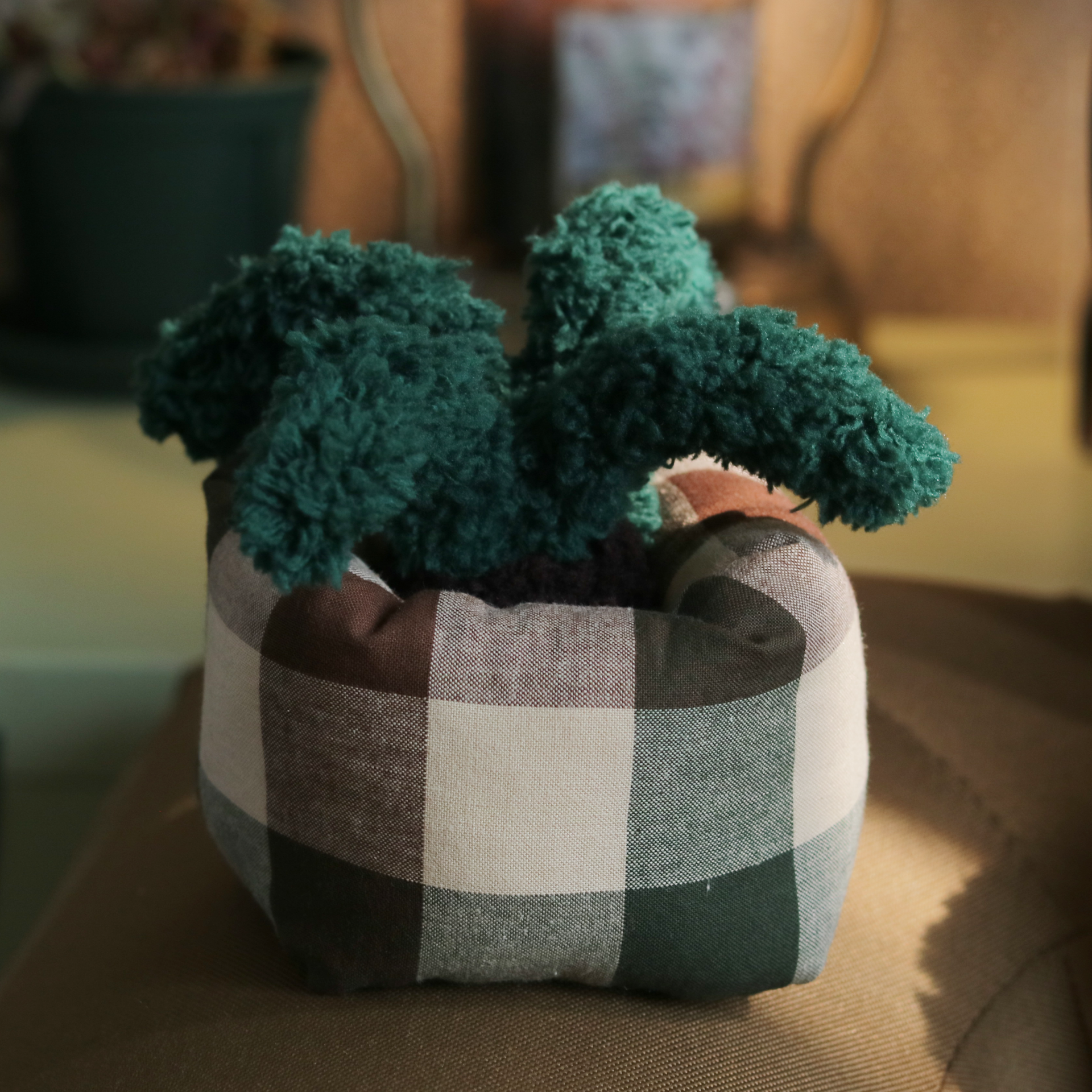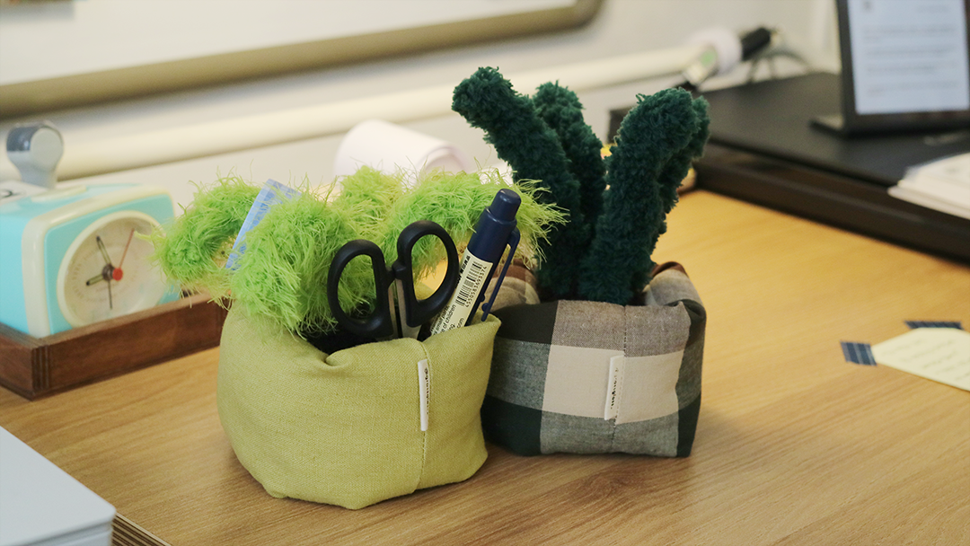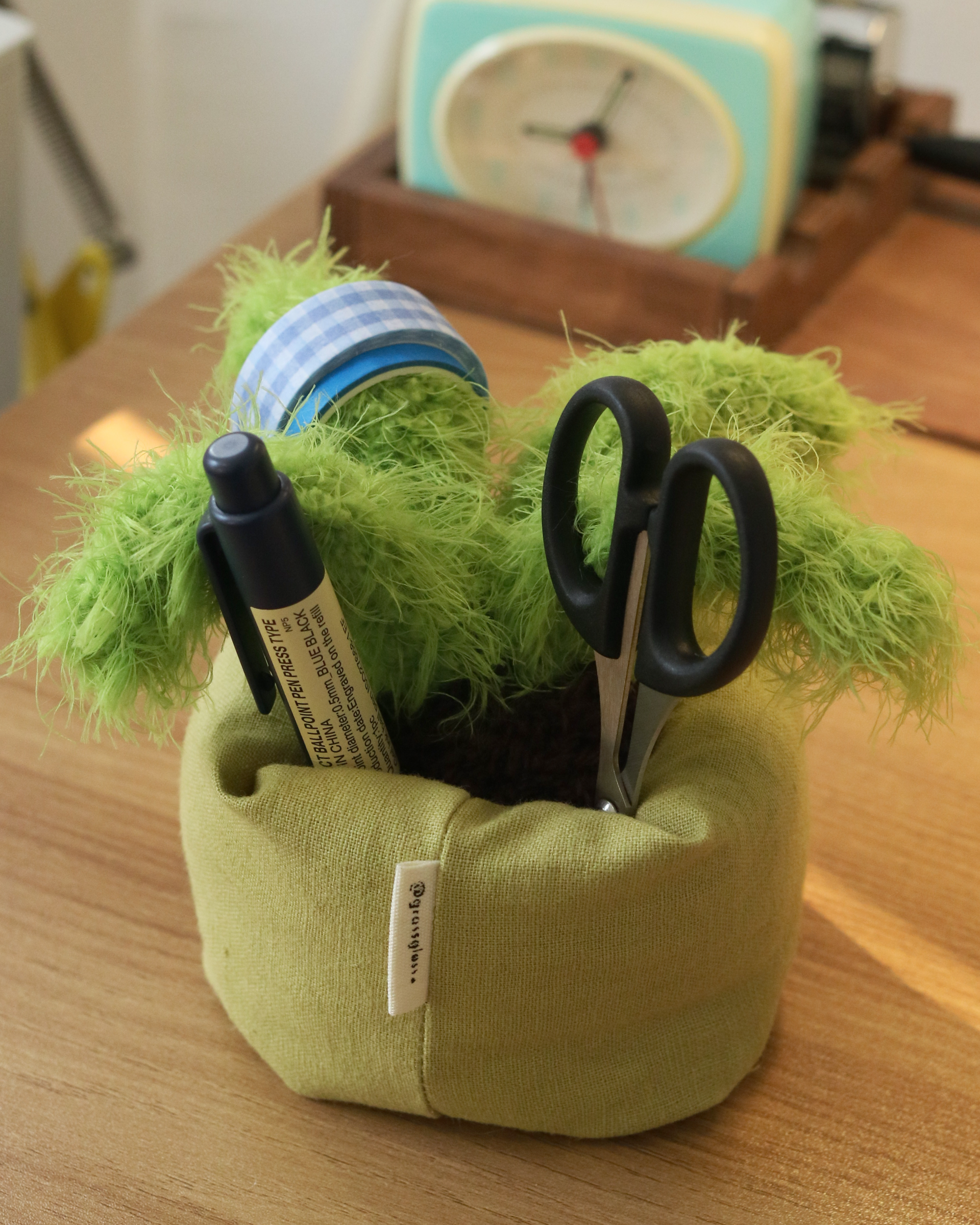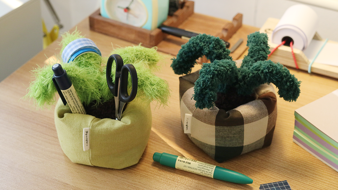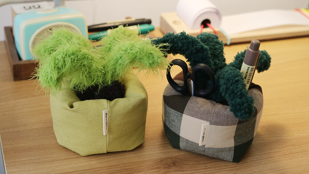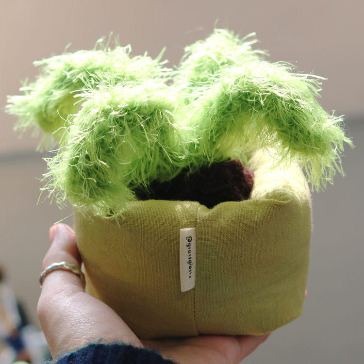 모루를 손으로 성형하고 재봉틀로 화분을 만든 핸드메이드 애착사물입니다.